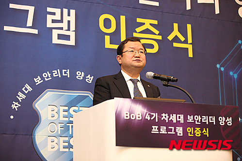【서울=뉴시스】미래창조과학부와 한국정보기술연구원(KITRI)이 23일 오후 서울 강남구 삼정호텔 아도니스홀에서 '제4기 차세대 보안리더 양성 프로그램 인증식' 을 개최했다. 최재유 미래창조과학부 제2차관이 격려사를 하고 있다. 2016.03.23. (사진=미래창조과학부 제공)