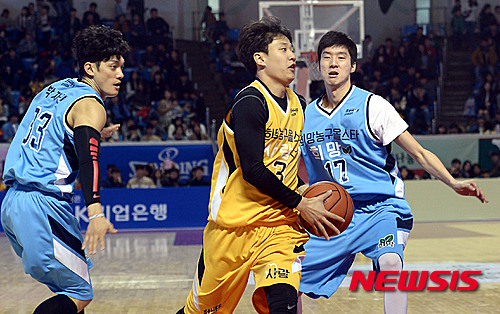 【서울=뉴시스】이영환 기자 = 27일 오후 서울 송파구 서울특별시 학생체육관에서 열린 2016 희망농구 올스타에서 사랑팀 허웅(가운데)이 수비를 피해 슛을 시도하고 있다.