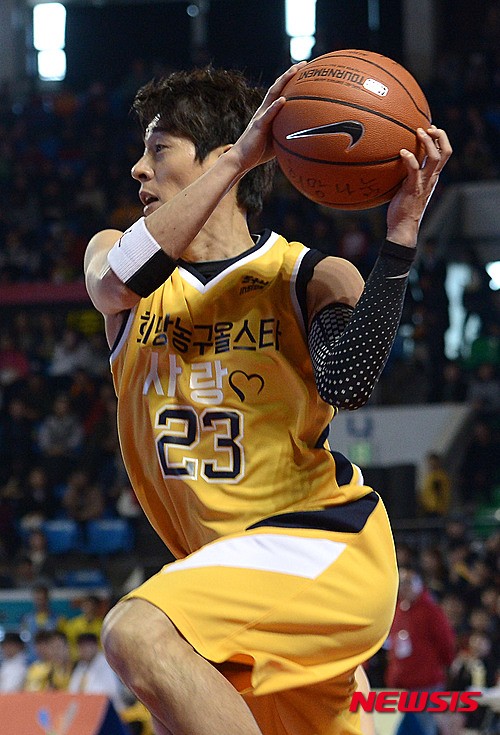 【서울=뉴시스】이영환 기자 = 27일 오후 서울 송파구 서울특별시 학생체육관에서 열린 2016 희망농구 올스타에서 사랑팀 배우 서지석이 레이업 슛을 하고 있다.