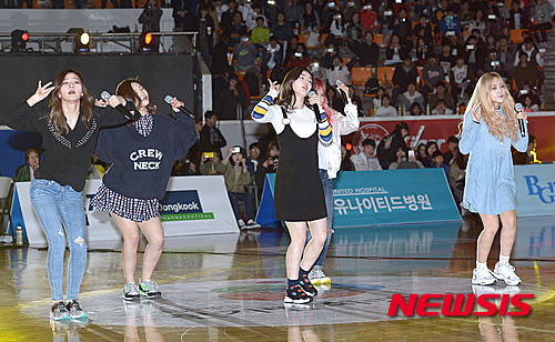 【서울=뉴시스】이영환 기자 = 27일 오후 서울 송파구 서울특별시 학생체육관에서 열린 2016 희망농구 올스타에서 걸그룹 레드벨벳이 축하공연을 하고 있다.