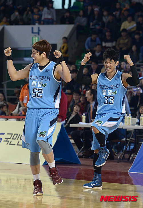 【서울=뉴시스】이영환 기자 = 27일 오후 서울 송파구 서울특별시 학생체육관에서 열린 2016 희망농구 올스타에서 희망팀 가수 정진운과 배우 박재민이 기쁨의 세레모니를 하고 있다.