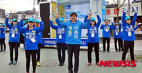 【익산=뉴시스】강명수 기자 = 4·13 총선의 본격적인 선거운동이 시작된 31일 전북 익산갑 선거구에 출사표를 던진 더불어민주당 이춘석 후보가 모현동 모현사거리에서 선거운동원들과 지지를 호소하며 선거전에 나서고 있다. 2016.03.31.