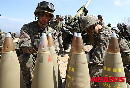 【고성=뉴시스】장세영 기자 = 4일 오전 강원도 고성군 야촌리사격장에서 열린 2016년 전반기 해상사격훈련에서 8군단 포병대대 장병들이 155mm 견인포 사격훈련을 준비하고 있다. 2016.04.04.