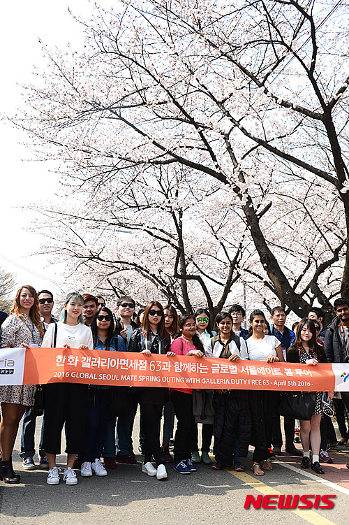 【서울=뉴시스】임태훈 기자 = 영등포 여의도 봄꽃축제가 열리고 있는 5일 오후 서울 영등포구 여의서로에서 글로벌 서울메이트 서울시 외국인 홍보사절단원들이 만개한 벚꽃을 배경으로 기념촬영을 하고 있다. 2016.04.05.