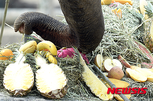 【과천=뉴시스】최진석 기자 = 먹방 열풍이 방송과 온라인을 통해 사회 전반적으로 유행이 되고 있는 6일 오후 경기 과천시 서울대공원 동물원에서 아시아코끼리가 먹이를 고르고 있다.