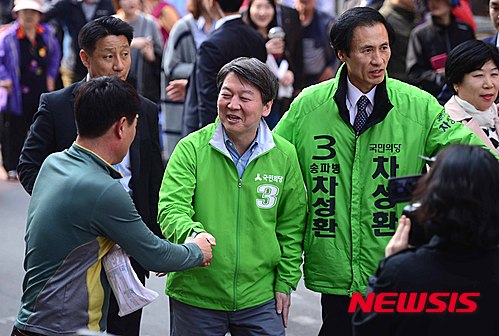 【서울=뉴시스】전신 기자 = 국민의당 안철수 상임공동대표가 7일 서울 송파구 마천시장에서 4.13 총선 송파구병 차성환 후보 지원 유세를 하고 있다. 2016.04.07.