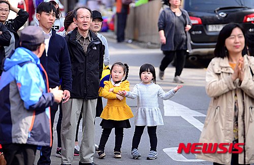 【서울=뉴시스】전신 기자 = 7일 서울 송파구 마천시장에서 어린이들이 4.13 총선 국민의당 송파구병 차성환 후보 유세 현장을 지켜보고 있다. 2016.04.07.