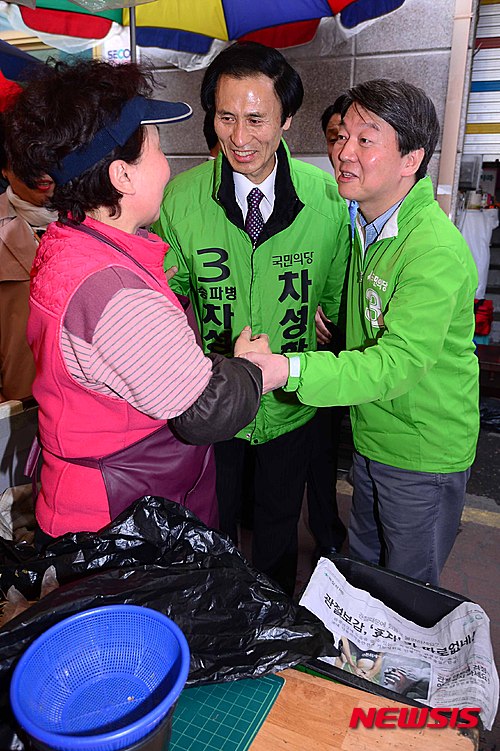 【서울=뉴시스】전신 기자 = 국민의당 안철수 상임공동대표가 7일 서울 송파구 마천시장에서 4.13 총선 송파구병 차성환 후보 지원 유세를 하고 있다. 2016.04.07.