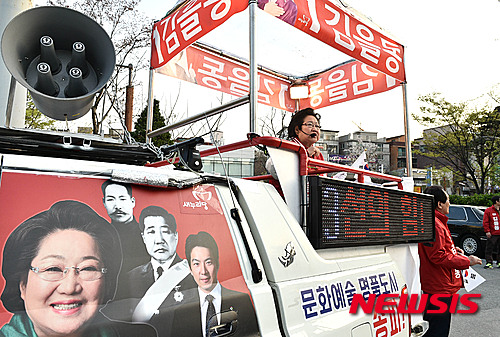 【서울=뉴시스】방지원 인턴기자 = 7일 오후 서울 송파구 문정역 근처에서 20대 총선에 출마하는 김을동 후보(송파병)가 시민들에게 지지를 호소하고 있다. 2016.04.07.