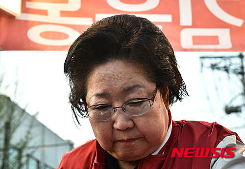 【서울=뉴시스】방지원 인턴기자 = 7일 오후 서울 송파구 문정역 근처에서 20대 총선에 출마하는 김을동 후보(송파병)가 사레에 들려 눈물이 흐르고 있다. 2016.04.07.