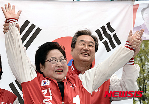 【서울=뉴시스】홍찬선 기자 = 4·13 총선을 삼일 앞둔 10일 오후 새누리당 김무성 대표가 서울 송파구 오금동 물빛광장에서 김을동(송파병) 후보 지원유세를 하며 손을 들어 시민들에게 인사를 하고 있다. 2016.04.10.