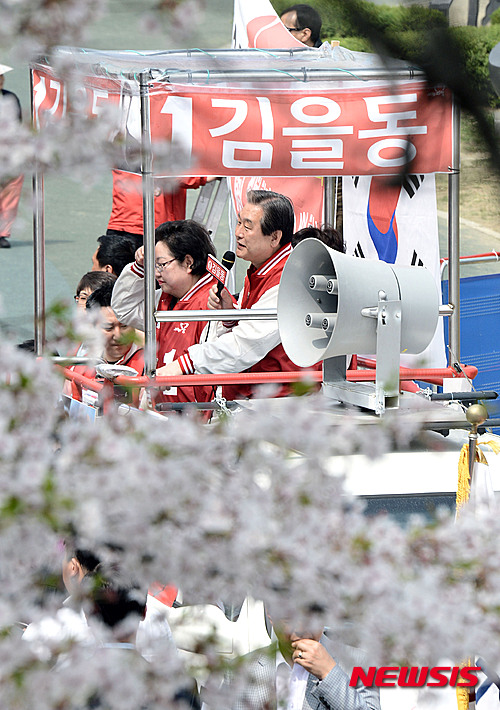 【서울=뉴시스】홍찬선 기자 = 4·13 총선을 삼일 앞둔 10일 오후 새누리당 김무성 대표가 서울 송파구 오금동 물빛광장에서 김을동(송파병) 후보 지원유세를 하고 있다. 2016.04.10.