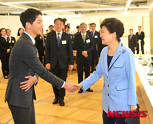 【서울=뉴시스】전진환 기자 = 박근혜 대통령이 11일 오전 서울 중구 청계천로 문화창조벤처단지에서 열린 케이스타일 허브 (K-Style Hub) 한식문화관 개관식에참석, 관광홍보대사 배우 송중기와 악수하고 있다. 2016.04.11.