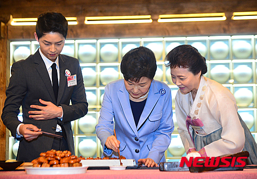 【서울=뉴시스】전진환 기자 = 박근혜 대통령이 11일 오전 서울 중구 청계천로 문화창조벤처단지에서 열린 케이스타일 허브 (K-Style Hub) 한식문화관 개관식에참석, 관광홍보대사 배우 송중기(왼쪽)와 함께 한식재단 윤숙자(오른쪽) 이사장의 설명을 들으며 약과를 만들고 있다. 2016.04.11.