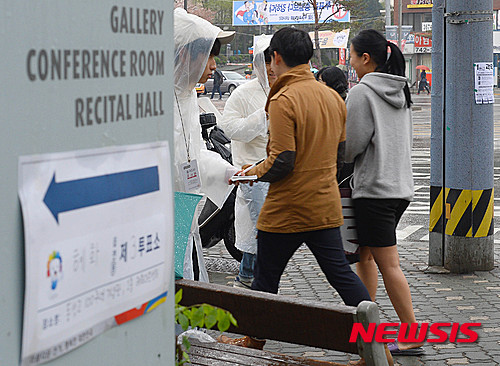 【서울=뉴시스】박문호 기자 = 제20대 국회의원선거가 시행된 13일 오전 서울 종로구 혜화동 동성고등학교 동성 100주년 기념관(혜화아트센터)에 마련된 투표소 앞에서 방송 3사 출구조사가 진행되고 있다.