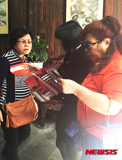 【뉴욕=뉴시스】노창현 특파원 = 배우 송혜교와 한국홍보전문가 서경덕 성신여대 교수가 4월13일 대한민국 임시정부수립일을 기해 중국 창사의 임시정부청사에 한글 안내서 1만부를 기증했다. 한글 안내서는 독립기념관의 자료제공으로 대한민국 임시정부 창사지역 활동 내용, 남목청 사건, 중국 지도자의 도움, 관람안내 등이 전면 컬러로 상세히 설명되어 있다. 두 사람은 그동안 항주 및 중경 임시정부청사와 상해 윤봉길 기념관, LA 도산 안창호 패밀리 하우스 등에도 한글 안내서를 제공했고, 네덜란드 헤이그 이준 열사 기념관에는 대형 부조작품을 기증한 바 있다. 관광객들이 한글 안내서를 이용하고 있다. 2016.04.15. <사진=서경덕교수 제공>