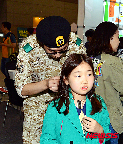 【광주=뉴시스】류형근 기자 = 15일 오전 광주 서구 김대중컨벤션센터에서 열린 찾아가는 경기관광박람회, 드라마 '태양의 후예' 체험부스에서 군복입은 연기자가 어린이에게 군번줄을 걸어주고 있다. 이날 개막해 17일까지 열리는 이번 행사는 경기도 각 지역의 특산물이 전시되고 다양한 공연이 펼쳐진다. 2016.04.15.