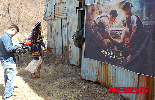 【정선=뉴시스】홍춘봉 기자 =중국 광둥, 쓰촨, 푸젠, 저장, 윈난 등 5개 성의 5개 TV방송국 PD와 촬영기사, 리포터 등이 15일 태양의 후예 촬영지인 강원 정선군 삼탄아트마인 현장에서 송혜교와 송중기의 현수막 앞에서 촬영하고 있다. 2016.04.15.