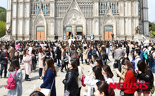 【서울=뉴시스】임태훈 기자 = 17일 오후 서울 동대문구 경희대학교 서울캠퍼스 평화의 전당에서 열린 송중기 팬미팅 '5th Fan meeting in Seoul 우리, 다시 만난 날'에 참석하러 온 팬들이 입장을 위해 긴 줄을 이루고 있다.