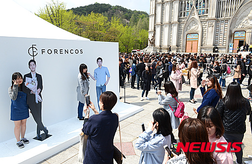 【서울=뉴시스】임태훈 기자 = 17일 오후 서울 동대문구 경희대학교 서울캠퍼스 평화의 전당에서 열린 송중기 팬미팅 '5th Fan meeting in Seoul 우리, 다시 만난 날'에 참석하러 온 팬들이 포토존에서 기념촬영을 하고 있다.