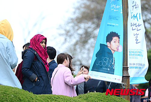 배우 송중기는 지난 14일 종영한 KBS 2TV 수목드라마 '태양의 후예'에서 특전사 대위 '유시진' 역을 맡아 열연했으며, 팬미팅 좌석은 사전 예약 판매를 통해 4000석 전석이 매진됐다. 2016.04.17.