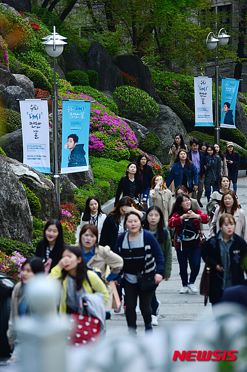 【서울=뉴시스】임태훈 기자 = 17일 오후 서울 동대문구 경희대학교 서울캠퍼스 평화의 전당에서 열린 송중기 팬미팅 '5th Fan meeting in Seoul 우리, 다시 만난 날'에 참석하러 온 팬들이 언덕길을 오르고 있다.