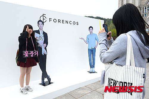【서울=뉴시스】임태훈 기자 = 17일 오후 서울 동대문구 경희대학교 서울캠퍼스 평화의 전당에서 열린 송중기 팬미팅 '5th Fan meeting in Seoul 우리, 다시 만난 날'에 참석하러 온 팬들이 포토존에서 기념촬영을 하고 있다.