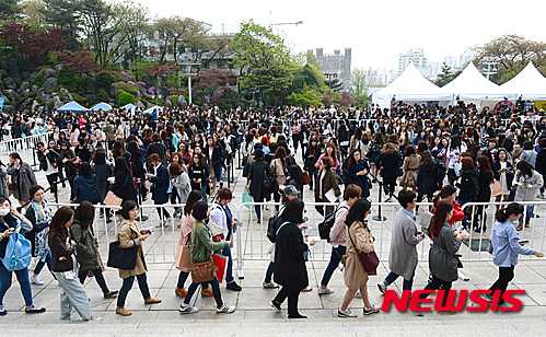 【서울=뉴시스】임태훈 기자 = 17일 오후 서울 동대문구 경희대학교 서울캠퍼스 평화의 전당에서 열린 송중기 팬미팅 '5th Fan meeting in Seoul 우리, 다시 만난 날'에 참석하러 온 팬들이 입장을 위해 긴 줄을 이루고 있다.