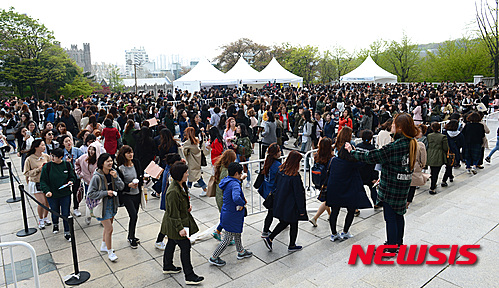 【서울=뉴시스】임태훈 기자 = 17일 오후 서울 동대문구 경희대학교 서울캠퍼스 평화의 전당에서 열린 송중기 팬미팅 '5th Fan meeting in Seoul 우리, 다시 만난 날'에 참석하러 온 팬들이 입장을 위해 긴 줄을 이루고 있다.