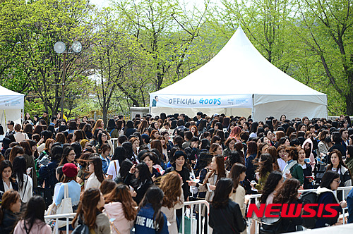 【서울=뉴시스】임태훈 기자 = 17일 오후 서울 동대문구 경희대학교 서울캠퍼스 평화의 전당에서 열린 송중기 팬미팅 '5th Fan meeting in Seoul 우리, 다시 만난 날'에 참석하러 온 팬들이 입장을 위해 긴 줄을 이루고 있다.