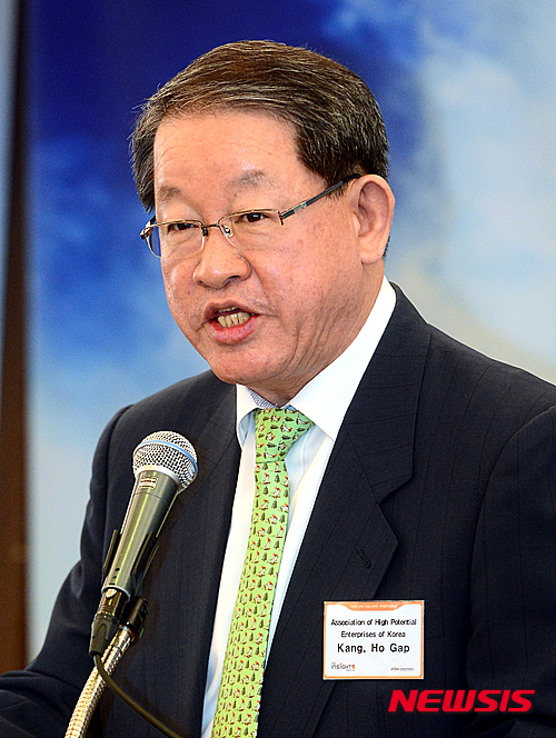 【서울=뉴시스】권현구 기자 = 강호갑 중견기업연합회 회장이 20일 오전 서울 중구 롯데호텔에서 열린 하산 타헤리안 주한 이란 대사 초청 'Ahpek INSIGHTS'에 참석해 환영사를 하고 있다. 2016.04.20.