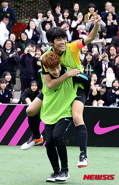 【서울=뉴시스】추상철 기자 = 나이키 풋볼 스쿨 챌린지 '4대4 미니 축구 경기'가 펼쳐진 21일 오후 서울 송파구 가락고등학교에서 골을 넣은 비스트 이기광이 가락고 학생과 함께 세러모니를 하고 있다.