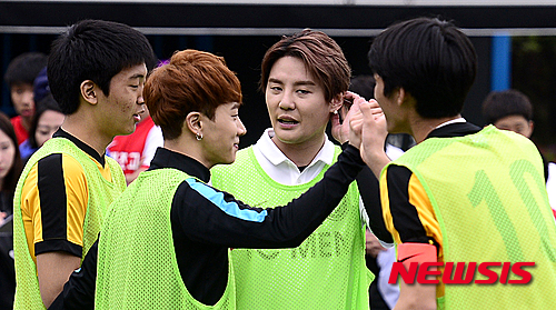 【서울=뉴시스】추상철 기자 = 나이키 풋볼 스쿨 챌린지 '4대4 미니 축구 경기'가 펼쳐진 21일 오후 서울 송파구 가락고등학교에서 비스트 이기광과 JYJ 김준수가 한 팀인 가락고 학생들과 함께 승리를 거둔 후 기뻐하고 있다.