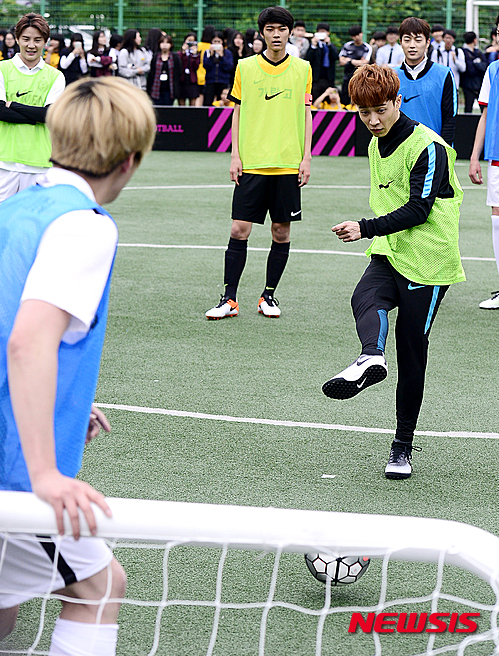 【서울=뉴시스】추상철 기자 = 나이키 풋볼 스쿨 챌린지 '4대4 미니 축구 경기'가 펼쳐진 21일 오후 서울 송파구 가락고등학교에서 비스트 이기광이 승부차기를 성공시키고 있다.