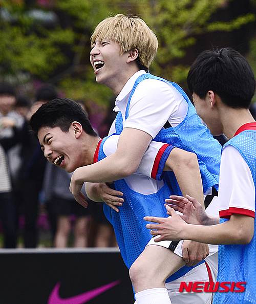 【서울=뉴시스】추상철 기자 = 나이키 풋볼 스쿨 챌린지 '4대4 미니 축구 경기'가 펼쳐진 21일 오후 서울 송파구 가락고등학교에서 골을 넣은 유키스 수현이 대진고 학생과 함께 기뻐하고 있다.