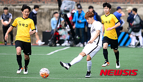 【서울=뉴시스】추상철 기자 = 나이키 풋볼 스쿨 챌린지 연예인 축구팀 'FC MEN'과 가락고 학생팀 간의 11대 11 스페셜 경기가 펼쳐진 21일 오후 서울 송파구 가락고등학교에서 비스트 이기광이 패스를 하고 있다.