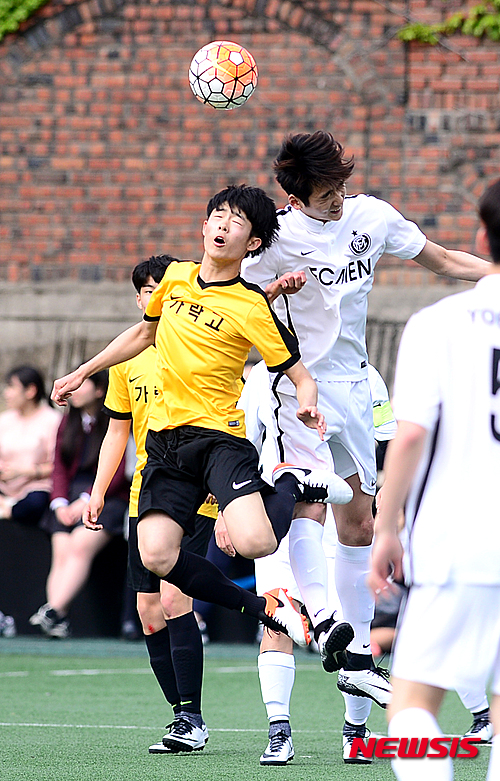 【서울=뉴시스】추상철 기자 = 나이키 풋볼 스쿨 챌린지 연예인 축구팀 'FC MEN'과 가락고 학생팀 간의 11대 11 스페셜 경기가 펼쳐진 21일 오후 서울 송파구 가락고등학교에서 모델 김성우가 가락고 학생과 공중볼 다툼을 하고 있다.