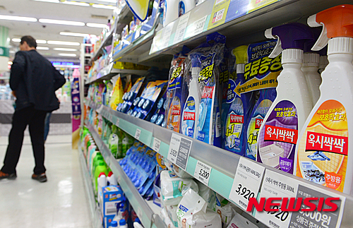 【서울=뉴시스】권현구 기자 = 가습기 살균제 사건과 관련해 가장 많은 피해자를 낸 옥시래킷 벤키저가 공식 사과를 했지만 온라인을 중심으로 불매운동이 번지고 있는 24일 오후 서울 시내 한 대형마트에 진열된 옥시크린 매대가 한산한 모습을 보이고 있다. 2016.04.24.