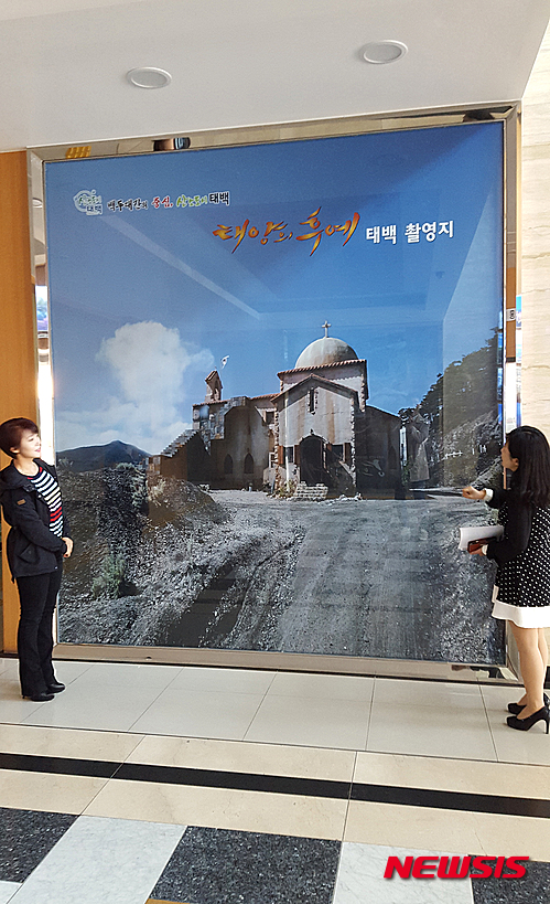 【태백=뉴시스】홍춘봉 기자 = 강원 태백시는 25일 시청 로비에 '태양의 후예' 촬영지 한보탄광 세트장을 촬영한 대형 사진을 전시해 놓고 있다. 2016.04.25.