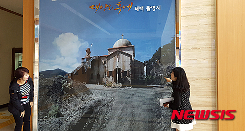 【태백=뉴시스】홍춘봉 기자 = 강원 태백시는 25일 시청 로비에 '태양의 후예' 촬영지 한보탄광 세트장을 촬영한 대형 사진을 전시해 놓고 있다. 2016.04.25.