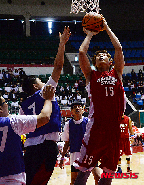 【서울=뉴시스】장세영 기자 = 25일 오후 서울 잠실학생체육관에서 열린 서울종합예술실용학교 2016 체육대회 연예인농구단 레인보우스타즈와 서울종합예술실용학교 학생간의 친선경기에서 연예인 농구단 2AM 정진운이 골밑 슛을 하고 있다. 2016.04.25.