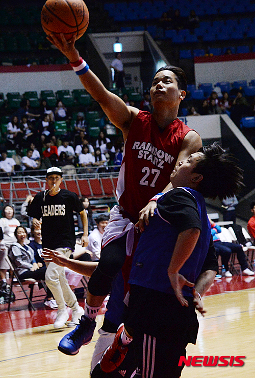 【서울=뉴시스】장세영 기자 = 25일 오후 서울 잠실학생체육관에서 열린 서울종합예술실용학교 2016 체육대회 연예인농구단 레인보우스타즈와 서울종합예술실용학교 학생간의 친선경기에서 연예인 농구단 랩퍼 허인창이 골밑 슛을 하고 있다. 2016.04.25.
