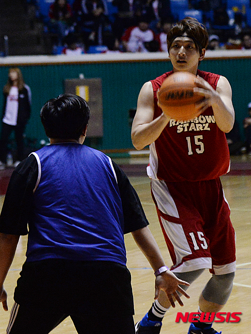 【서울=뉴시스】장세영 기자 = 25일 오후 서울 잠실학생체육관에서 열린 서울종합예술실용학교 2016 체육대회 연예인농구단 레인보우스타즈와 서울종합예술실용학교 학생간의 친선경기에서 연예인 농구단 2AM 정진운이 미들 슛을 하고 있다. 2016.04.25.
