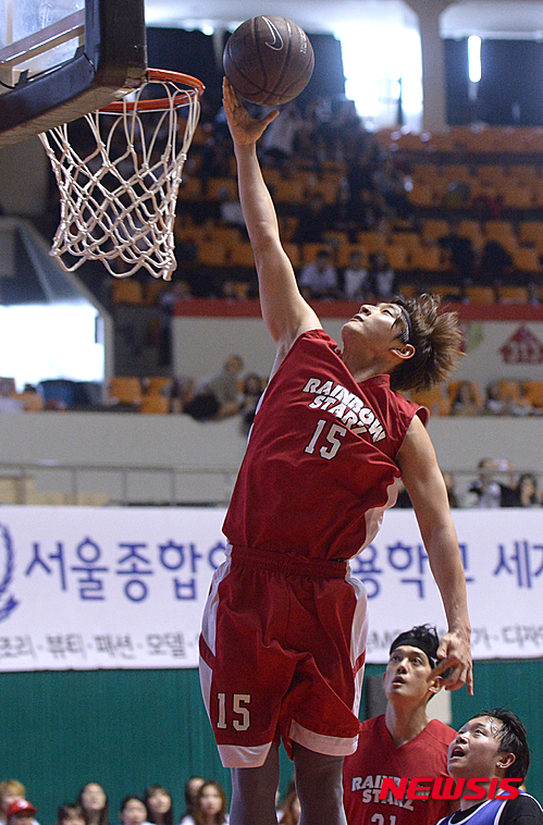 【서울=뉴시스】장세영 기자 = 25일 오후 서울 잠실학생체육관에서 열린 서울종합예술실용학교 2016 체육대회 연예인농구단 레인보우스타즈와 서울종합예술실용학교 학생간의 친선경기에서 연예인 농구단 2AM 정진운이 골밑 슛을 하고 있다. 2016.04.25.