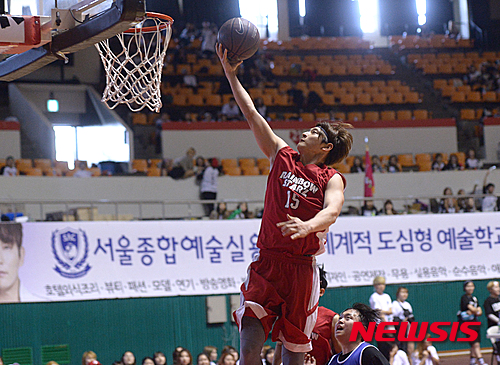 【서울=뉴시스】장세영 기자 = 25일 오후 서울 잠실학생체육관에서 열린 서울종합예술실용학교 2016 체육대회 연예인농구단 레인보우스타즈와 서울종합예술실용학교 학생간의 친선경기에서 연예인 농구단 2AM 정진운이 골밑 슛을 하고 있다. 2016.04.25.