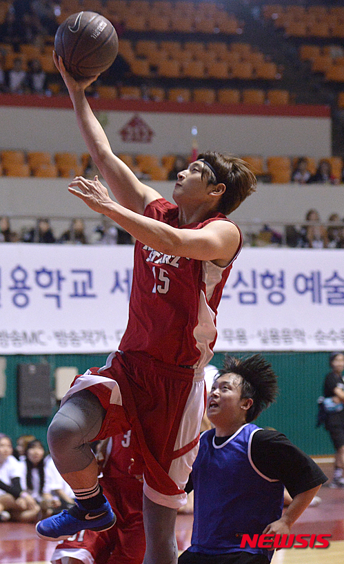 【서울=뉴시스】장세영 기자 = 25일 오후 서울 잠실학생체육관에서 열린 서울종합예술실용학교 2016 체육대회 연예인농구단 레인보우스타즈와 서울종합예술실용학교 학생간의 친선경기에서 연예인 농구단 2AM 정진운이 골밑 슛을 하고 있다. 2016.04.25.