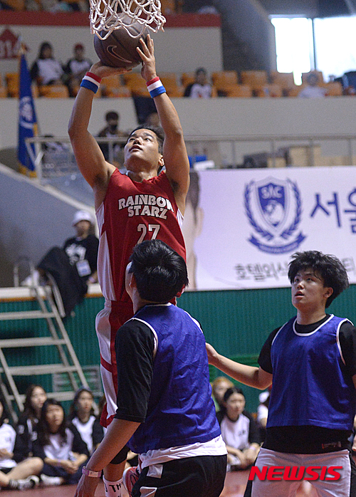 【서울=뉴시스】장세영 기자 = 25일 오후 서울 잠실학생체육관에서 열린 서울종합예술실용학교 2016 체육대회 연예인농구단 레인보우스타즈와 서울종합예술실용학교 학생간의 친선경기에서 연예인 농구단 랩퍼 허인창이 골밑 슛을 하고 있다. 2016.04.25.