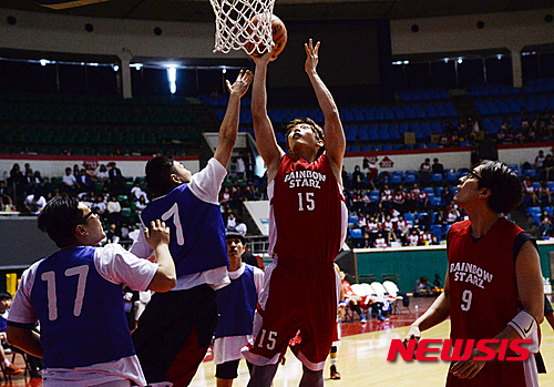 【서울=뉴시스】장세영 기자 = 25일 오후 서울 잠실학생체육관에서 열린 서울종합예술실용학교 2016 체육대회 연예인농구단 레인보우스타즈와 서울종합예술실용학교 학생간의 친선경기에서 연예인 농구단 2AM 정진운이 골밑 슛을 하고 있다. 2016.04.25.