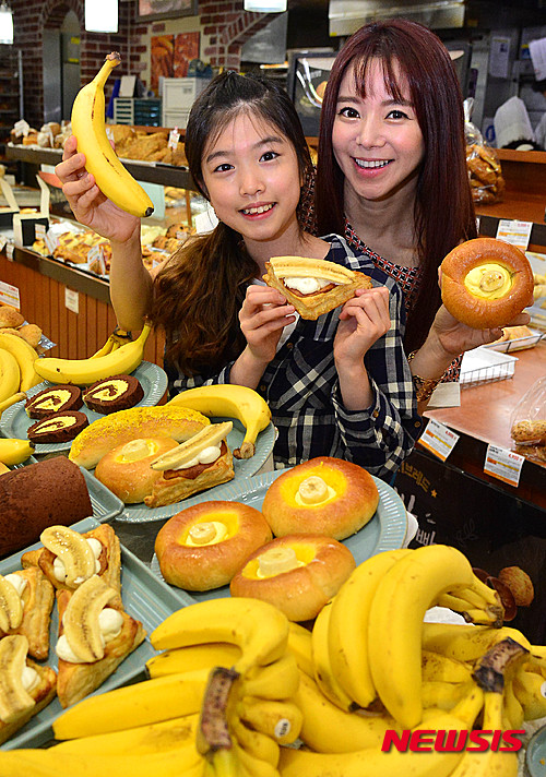 【서울=뉴시스】김선웅 기자 = 1일 오전 서울 중구 롯데마트 서울역점에서 모델들이 '맛있으면 바나나빵' 5종을 선보이고 있다.