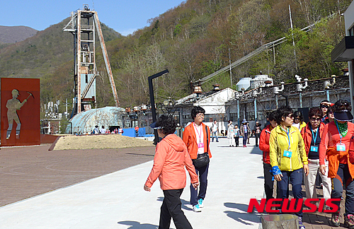 【정선=뉴시스】홍춘봉 기자 = 1일 첫 운행에 나선 이색 관광열차 'E-Tarin'을 타고 한류열풍을 일으킨 '태양의 후예' 촬영지인 강원 정선군 삼탄아트마인을 찾은 열차 관광객들이 송중기·송혜교가 열연한 드라마 촬영현장을 둘러보고 있다.2016.05.01.